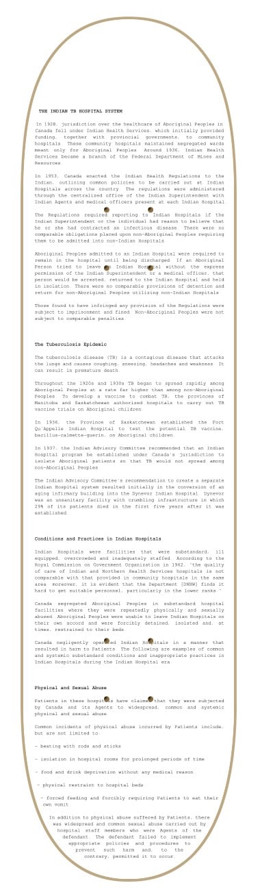 returned to their communities unless the costs were paid by family, which resulted in many patients being buried in unmarked graves far away from their local communities. Although most Indian hospitals had been closed by the early 1980s, survivors have begun to seek financial compensation and a formal acknowledgement of widespread mistreatment and abuse at Indian hospitals. In January 2018, a $1.1-billion class-action lawsuit was filed against the federal government on behalf of former patients. This board graphic attempts to shed light on just a few of the many complex aspects of Indian hospitals in