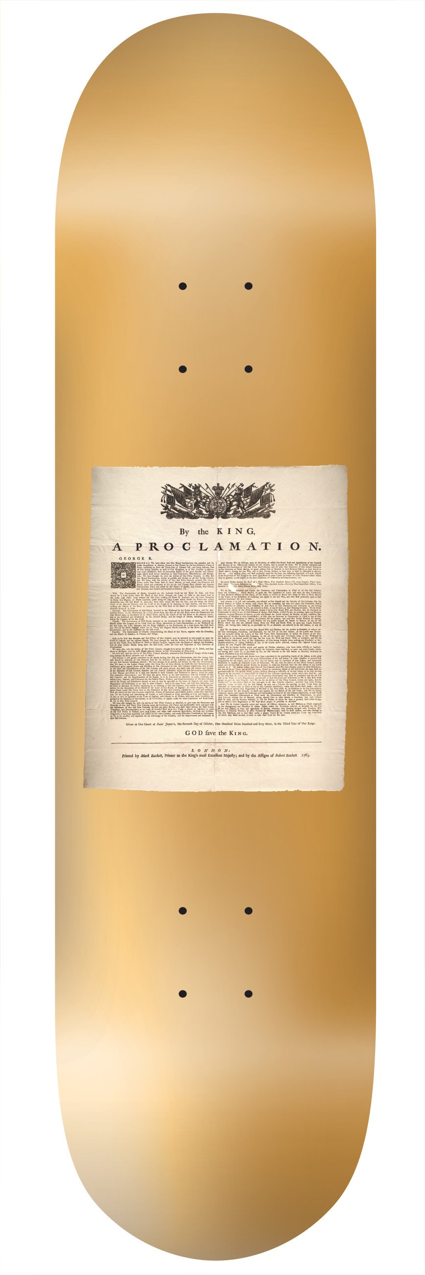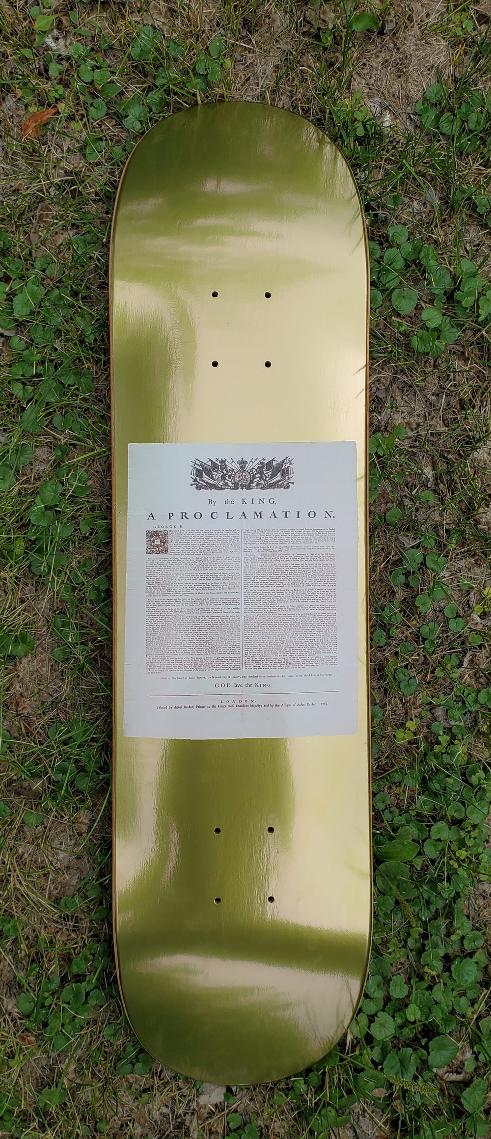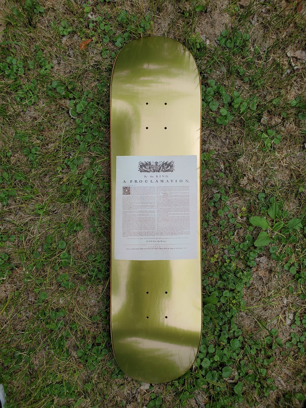 The next graphic Colonialism looks at is the history surrounding the Royal Proclamation of 1763. The skateboard graphic features the original document which King Henry 3rd issued on October 7th, 1763. The Royal Proclamation gave way to the governing on Turtle Island (North America) which was surrendered by France to the British after the Seven Years’ War. The Royal Proclamation of 1763 recognizes Aboriginal rights to the lands, and it affirmed that these rights would continue to exist into the future. The Royal Proclamation is also called “The Indian Bill of Rights” or the “Indian Magna Carta” (Royal Proclamation). The Royal Proclamation set out the framework to negotiate Treaties with First Nations peoples living on Turtle Island. The Proclamation is also referenced in Section 25 of the Canadian Constitution Act of 1982.